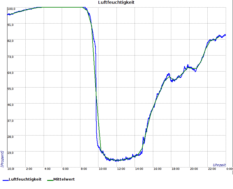 | Luftfeuchtigkeit [Proezent relativ] | 13,4 | 11:55:00 | 100,0 | 03:12:00 | 67,4 |