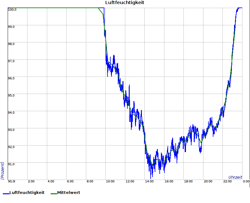 | Luftfeuchtigkeit [Proezent relativ] | 90,1 | 14:38:39 | 100,0 | 23:39:58 | 96,3 |