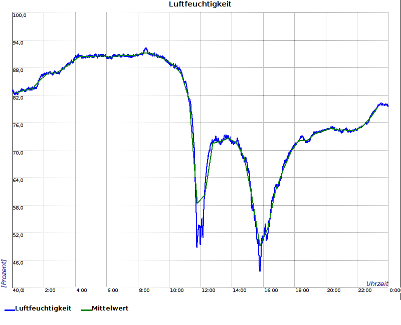 | Luftfeuchtigkeit [Proezent relativ] | 43,6 | 15:47:39 | 92,4 | 08:29:09 | 78,5 |